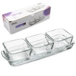 This elegant set includes three bowls paired with a sleek glass serving tray, perfect for presenting sauces, dips, or condiments. Whether you’re hosting a dinner party or enjoying a casual meal, this set adds a touch of sophistication to your table. The glass tray not only provides a stable base for the bowls but also enhances the overall presentation. Ideal for both everyday use and special occasions.